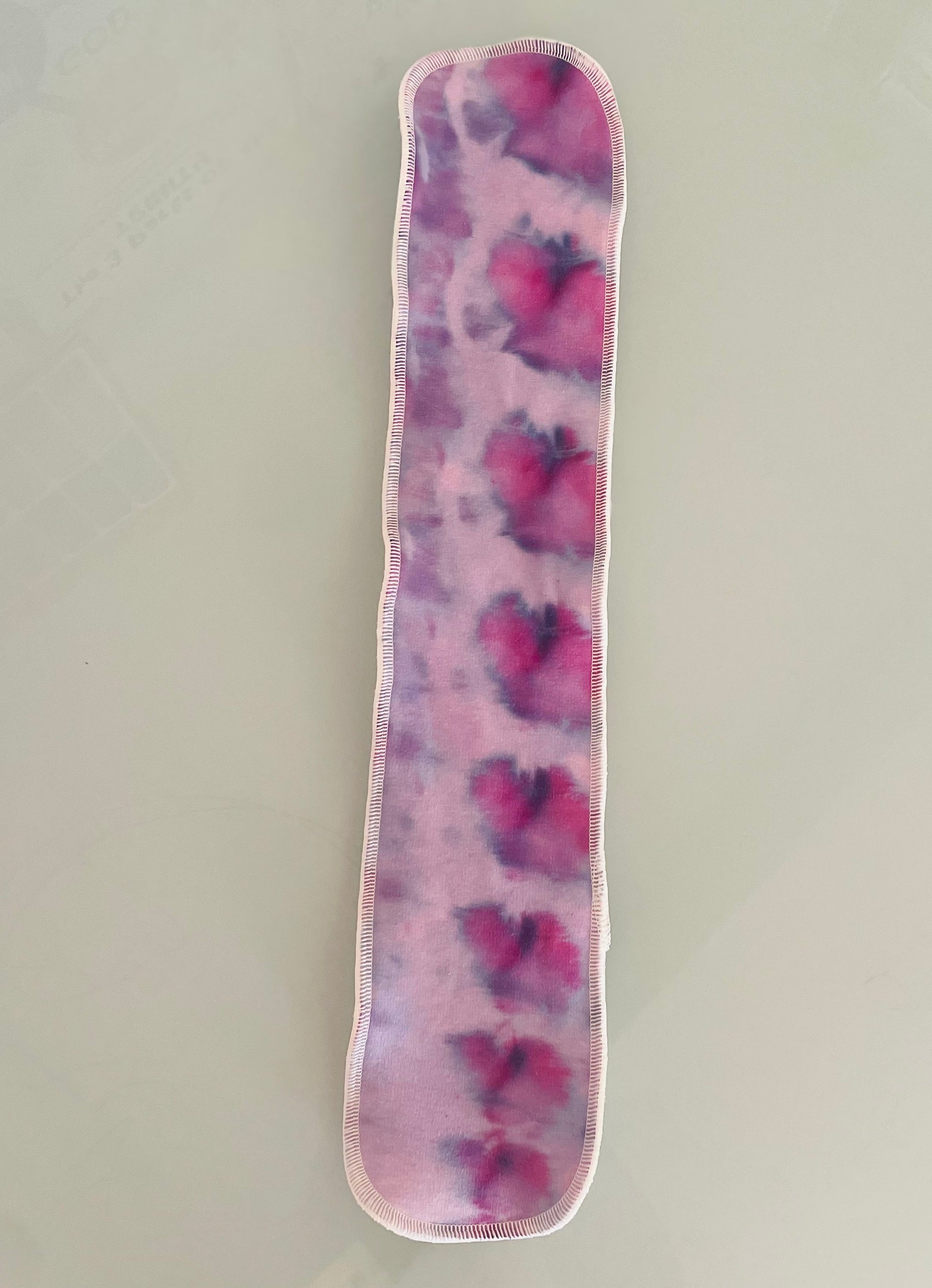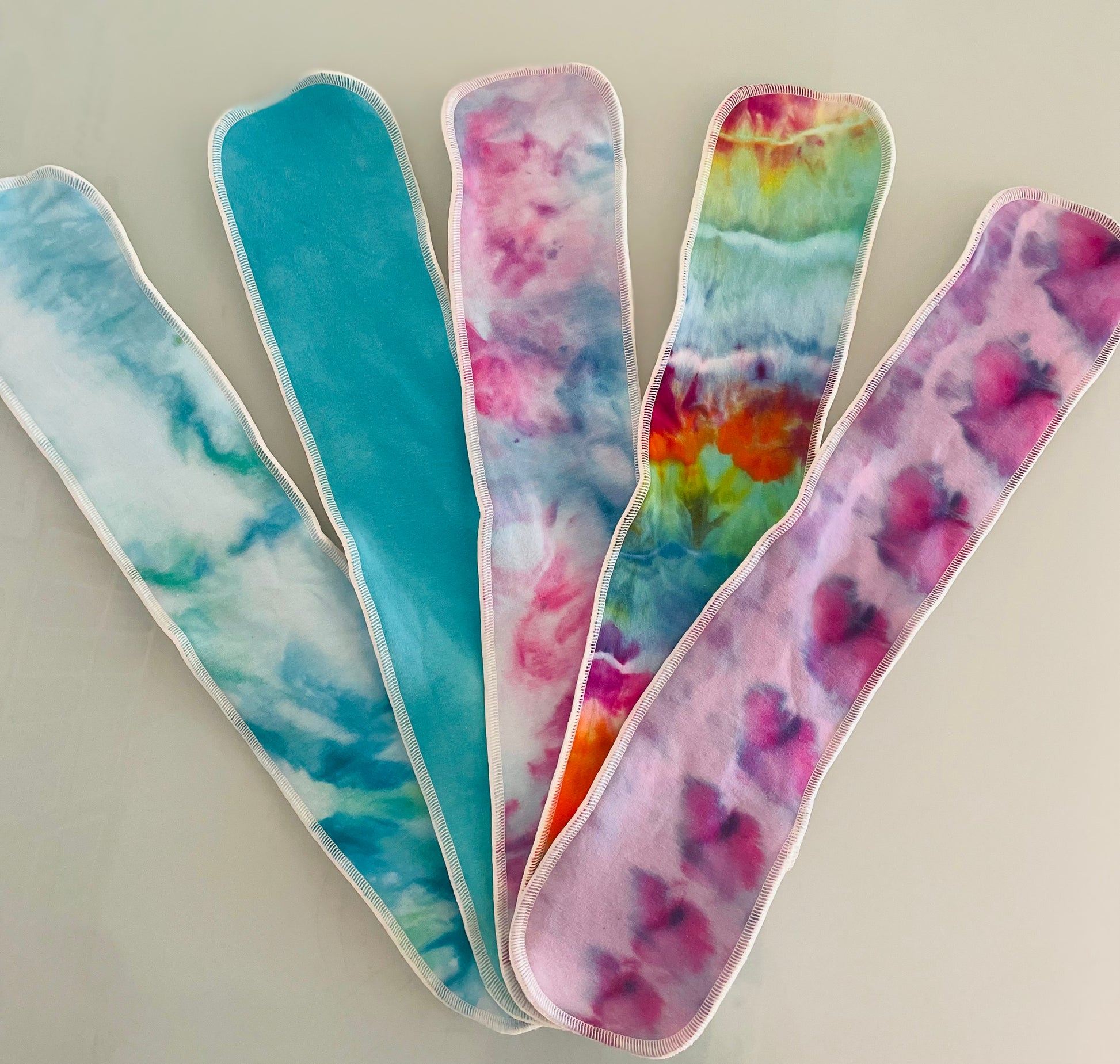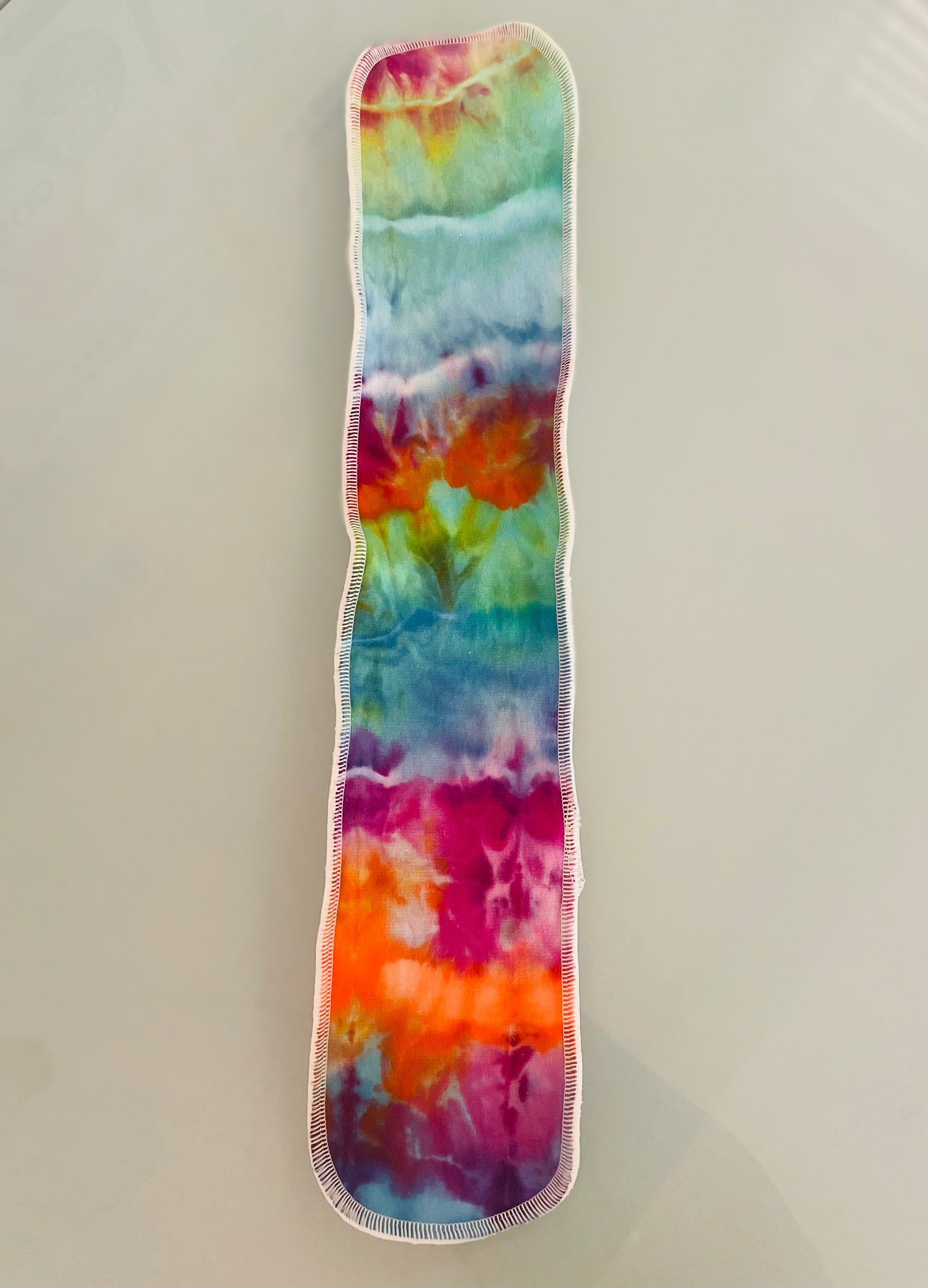 22 Inch Long Insert! Two skin safe, thirsty layers of 500gsm (per layer) bamboo/cotton blend topped with coordinated 340gsm Hand dyed layer of Hemp/Cotton blend for a total of 1340gsm unfolded. Folds over itself to give you extra layers anywhere you need them. Heavy wetter approved! Works great stand alone or as part of any existing diapering system!